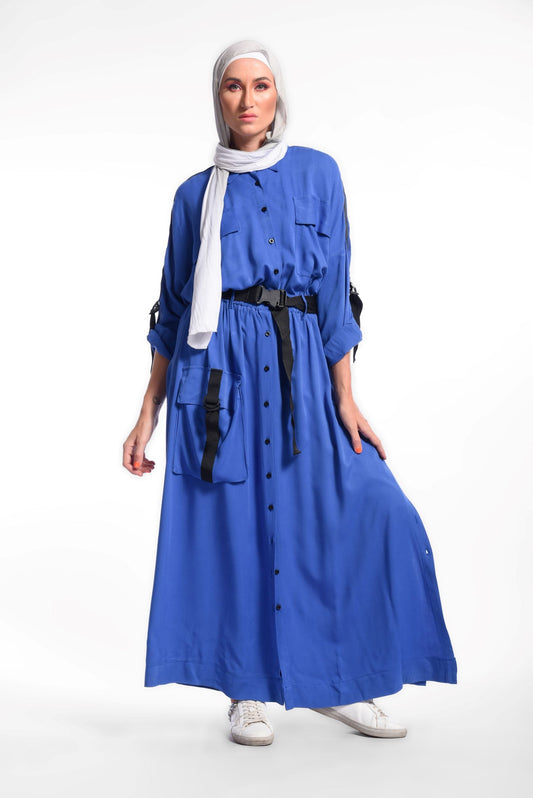 Baby Blue Drawstring Waist Slit Side Striped Dress Long Sleeve