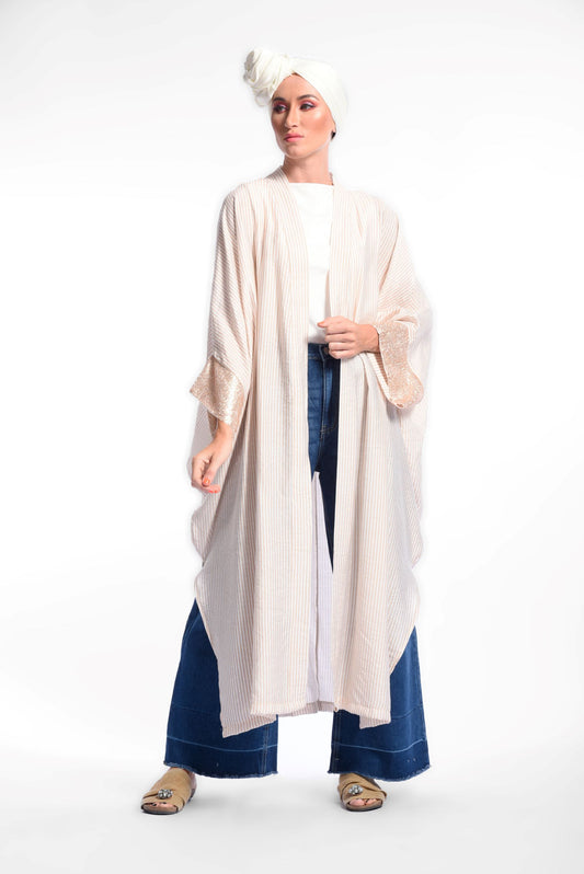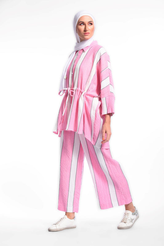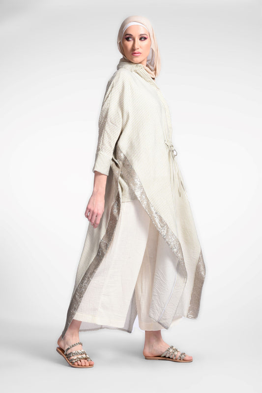 Beige Drawstring Waist Slit Side Striped Dress Long Sleeve