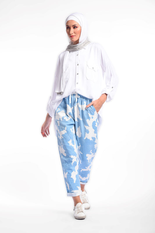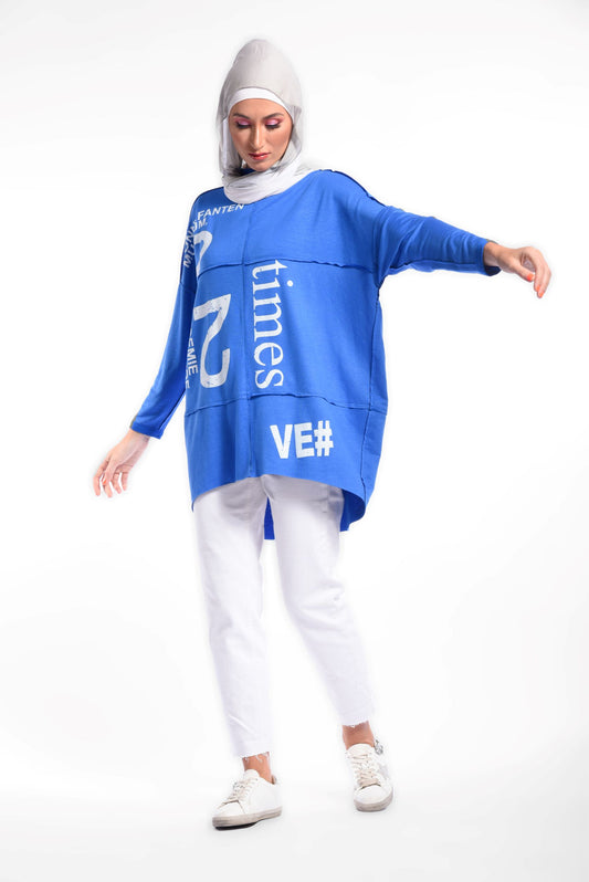 Blue Round Neck Long Sleeves High-Low Loose T-Shirt