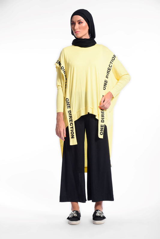 Yellow Round Neck Long Sleeves High-Low Loose T-Shirt
