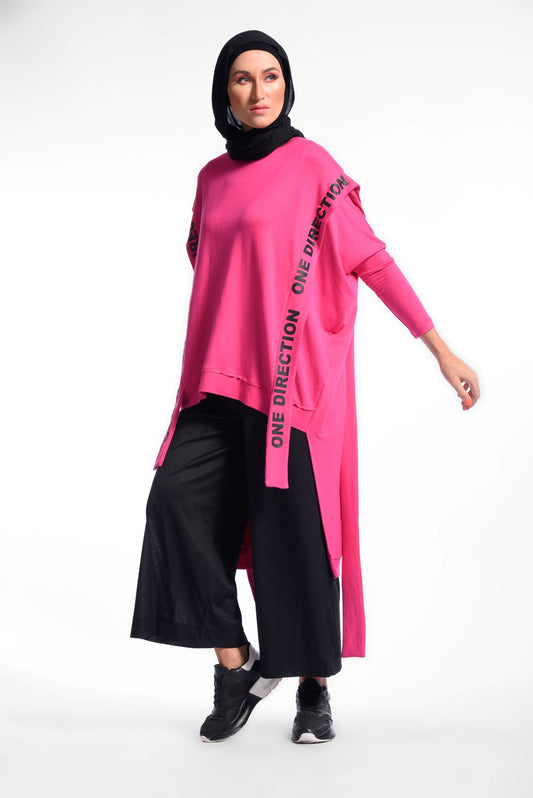 Fuchsia Round Neck Long Sleeves High-Low Loose T-Shirt